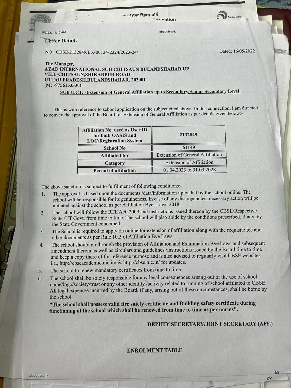 Affiliation Code of AZAD INTERNATIONAL SCHOOL IS 2132849