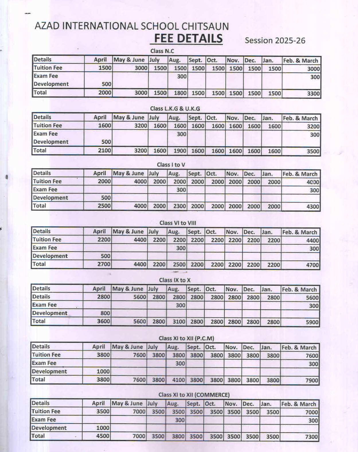 - The fee for the month of March and June will be charged along with the fee of February and May respectively, every year.
